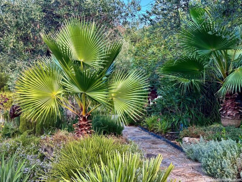 Looking to make a vertical composition, I made these two photos that are slightly different. One is much more about the fan palm, where it is almost dead center, and the other is more about the garden and the pathway leading through it.
