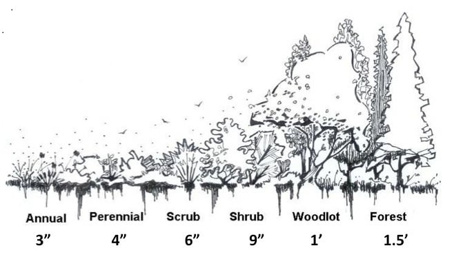 Dry to depths can become part of deciding irrigation schedules. With mixed plantings, however, it can get complicated. You would not want to allow the soil under a small or shallow-rooted plant to dry out all the way down to large tree depths because that could introduce drought stress needlessly for those shallower rooted plants. Conversely, keeping water in the top few inches can encourage shallow rooting for large plants like trees and shrubs. Using dry to depths effectively ensures a period of drying between watering which encourages soil respiration which was discussed above, but it needs to come with thoughtful planting and irrigation design.