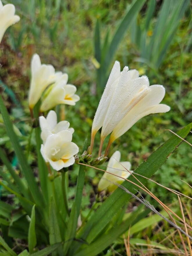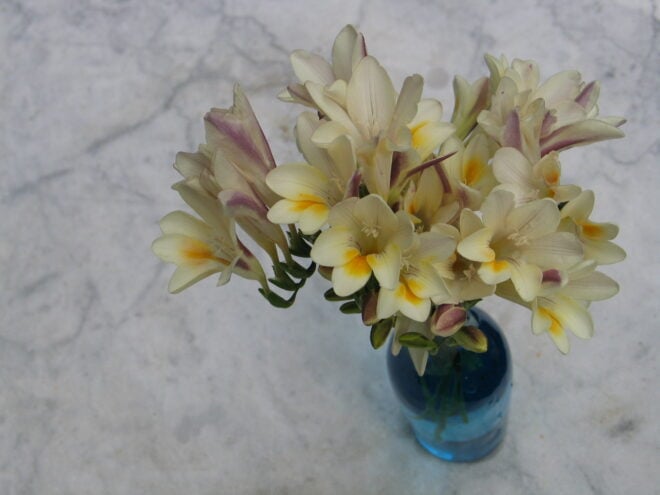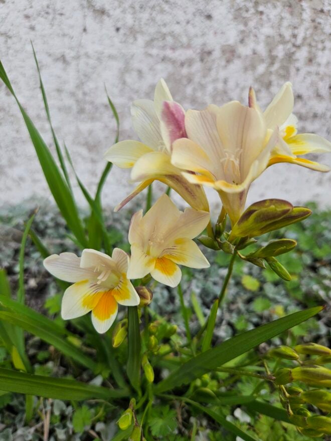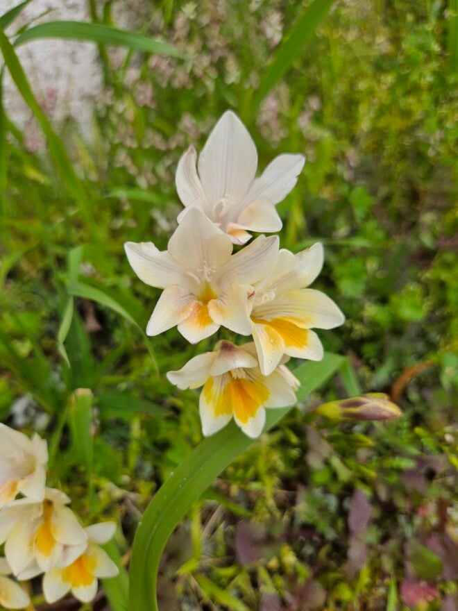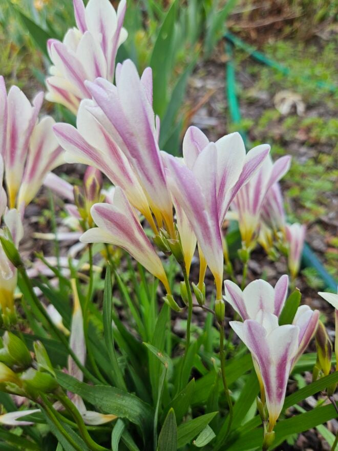 These are noticeably smaller than the modern hybrid Freesia that you’d find at the florist or in the supermarket plant section. Their blooms are not displayed as well spaced as those, either, and open successively, but relatively quickly.