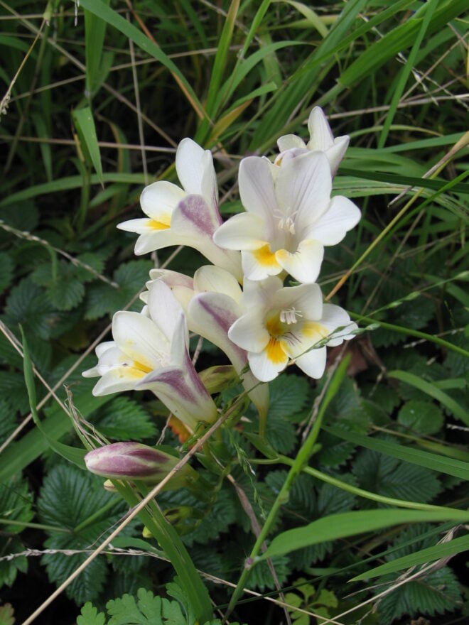 Freesia leichtlinii subsp. alba is a flowering plant in the iris family. It is native to the Cape Provinces of South Africa, but this species is grown on other continents where they have been introduced. Freesia leichtlinii subsp. alba is an herbaceous perennial growing from a corm and producing an erect, often branched stem up to 40 cm (16 in) centimeters tall with several lanceolate leaves up to about 15 centimeters long. The inflorescence has several trumpet-shaped fragrant flowers with white tepals marked with yellow and purple. Beware of plants sold as Freesia ‘Antique White’, they are not be the species we are talking about, but a soft white colored hybrid instead. A previous name is Freesia alba, but using that name is too generic and may result in inaccurate search results.