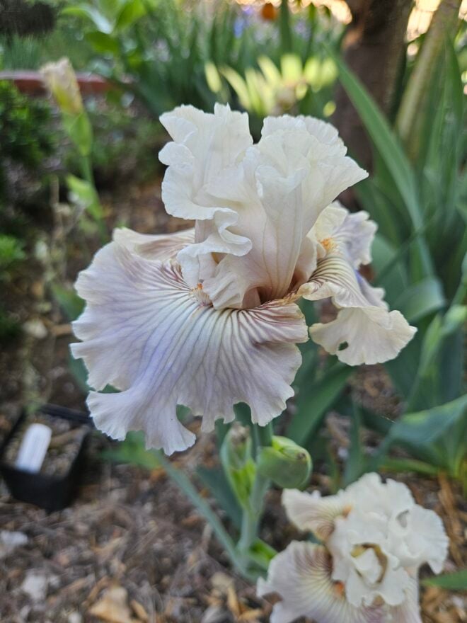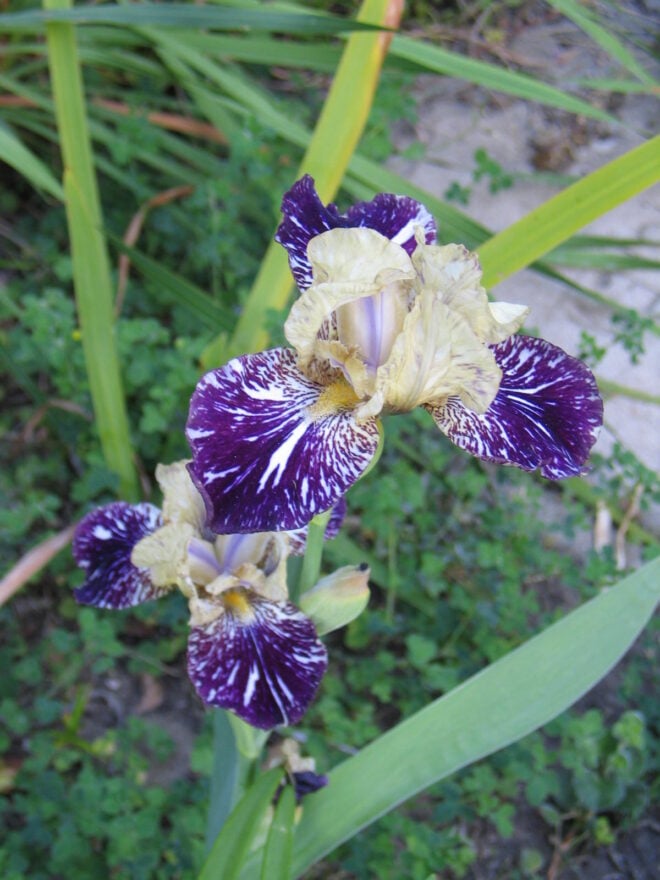 Bearded iris are herbaceous perennials with sword-shaped leaves that are a grey-green in color. They are rhizomatous. As leaves come and go over the years, the leaves on a rhizome come from the growing eyes of the rhizome, it can fan out in multiple directions, forming a clump with age. The flowers usually come several to a stem, blooming sequentially. Wikipedia claims that the roots can go 4” deep, but I’ve had much deeper roots than that when I’ve dug them up for dividing in the fall.