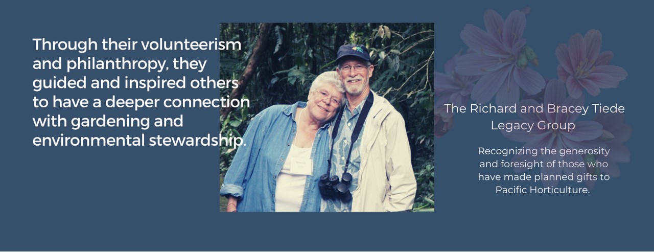 When you include Pacific Horticulture in your estate plans you join a visionary group of generous people who, like Richard and Bracey Tiede, demonstrate the power of gardens to enrich lives and heal the environment.